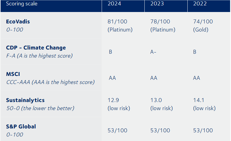 We are continuously cooperating with leading sustainability rating agencies, such as MSCI, Sustainalytics, EcoVadis, the Carbon Disclosure Project (CDP) and S&P Global. We are proud to be rated among the best performing companies in our industry.