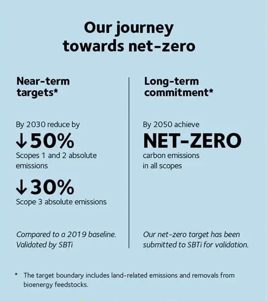 We have committed to reaching net-zero emissions by 2050, both in our own operations (scope 1 and 2) and across the value chain (scope 3). Our targets and accounting principles are developed in line with the Science Based Targets initiative (SBTi) framework , to ensure that our decarbonisation strategy is based on the latest climate science and is in line with the goals of the Paris Agreement.